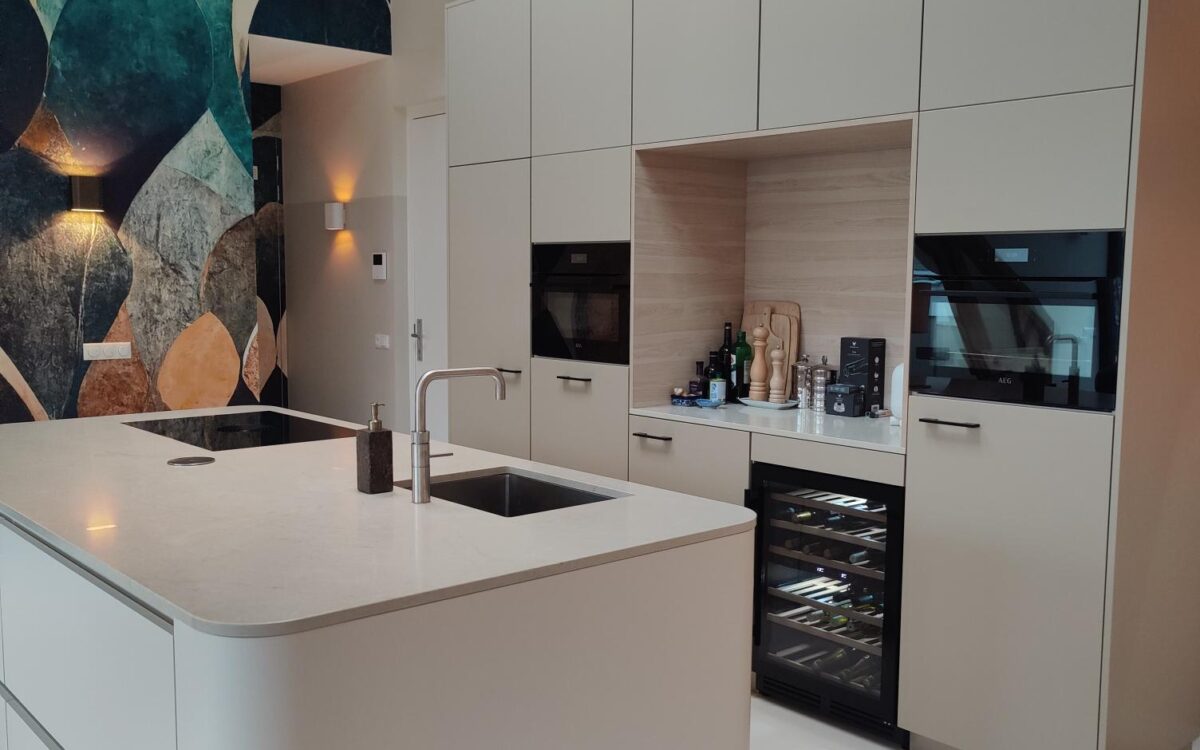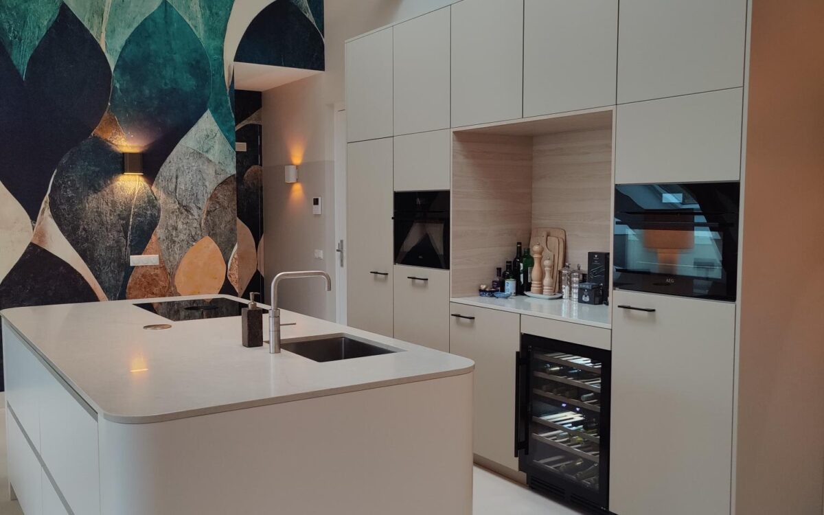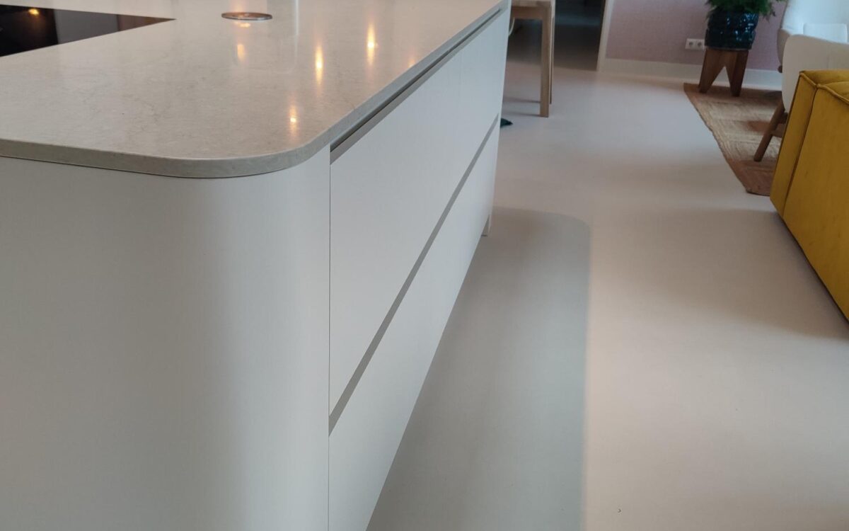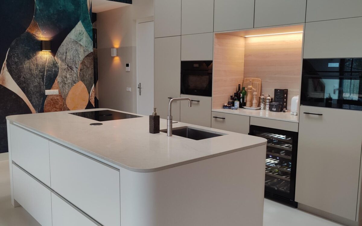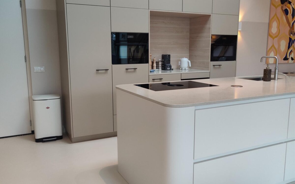 Wat een fantastische leefruimte, waarin deze keuken echt het stralende middelpunt vormt in een geweldig appartement! Het is meer dan alleen een plek om te koken; het is een ruimte die uitnodigt om samen te komen, te genieten en te leven. De afgeronde hoeken van deze keuken springen direct in het oog en geven het geheel een zachte, elegante uitstraling. Deze subtiele rondingen zorgen niet alleen voor een vloeiend en harmonieus design, maar versterken ook het ruimtelijke gevoel. De combinatie van moderne materialen, verfijnde vormen en een hoogwaardige afwerking maakt deze keuken niet alleen functioneel, maar ook een lust voor het oog.