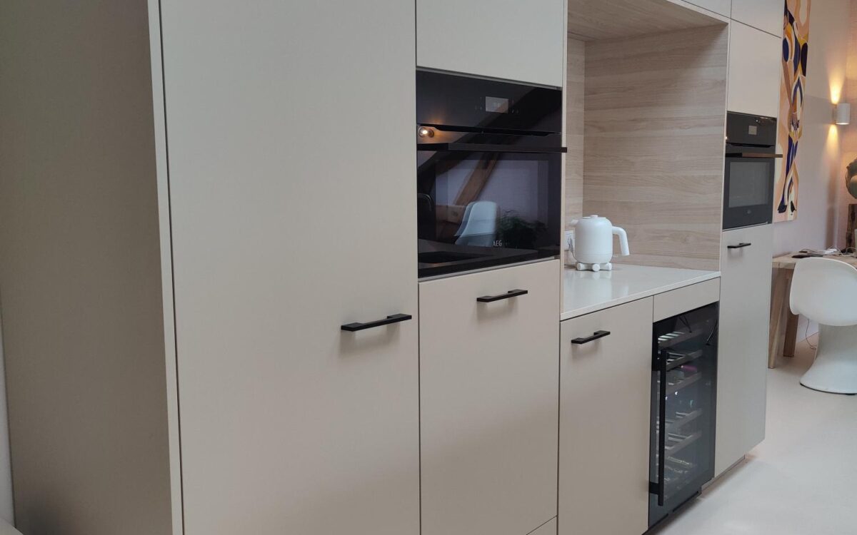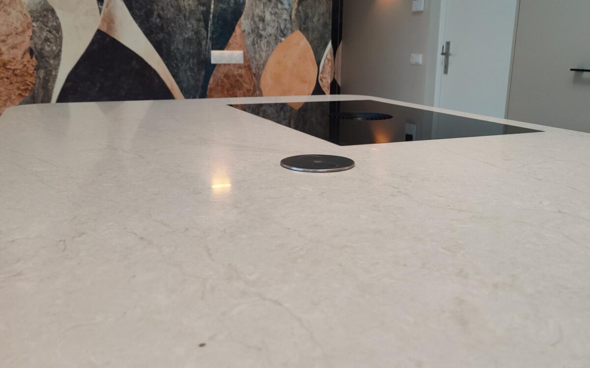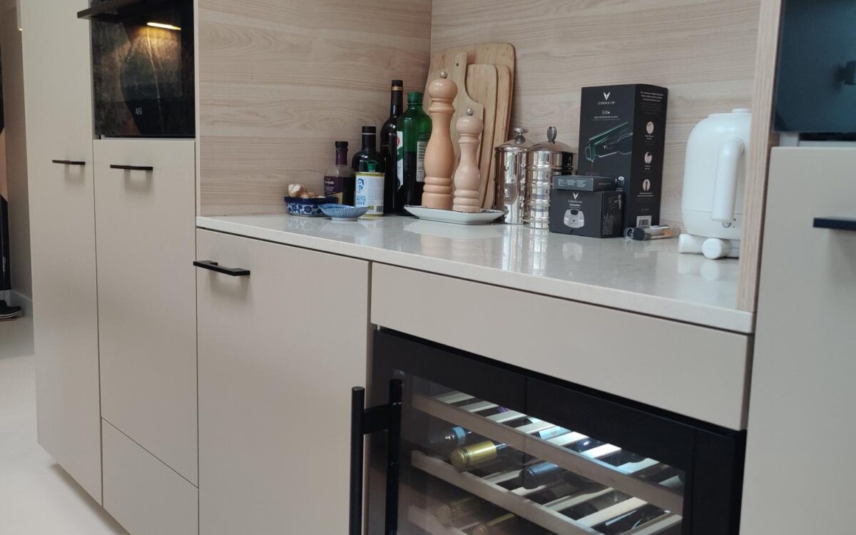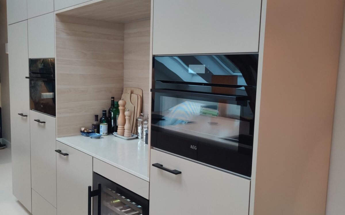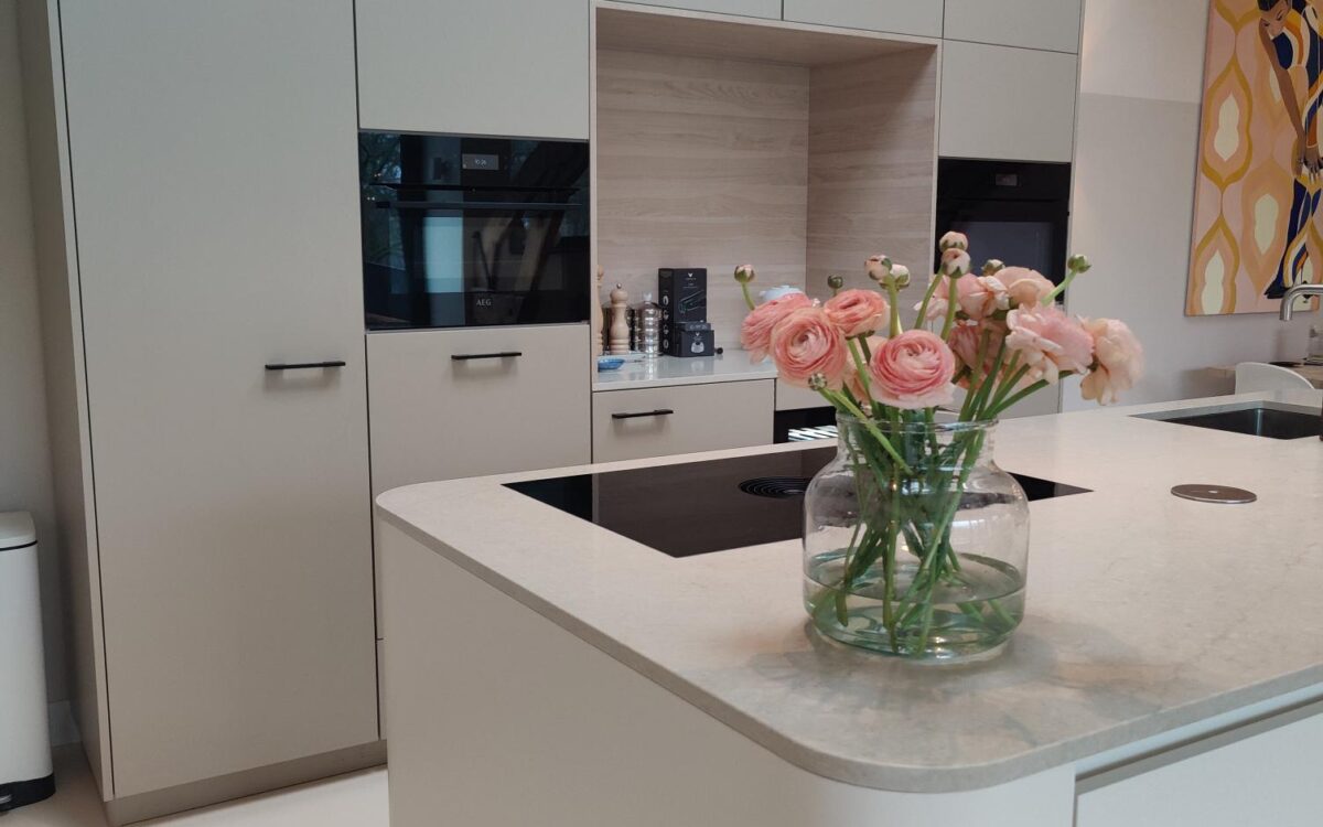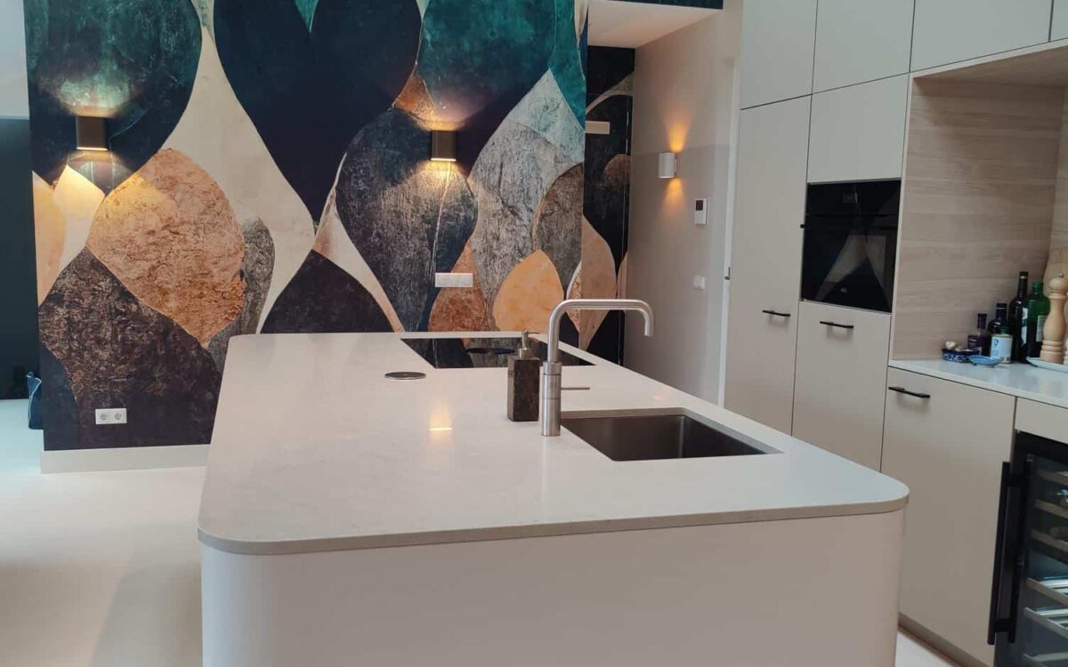 Wat een fantastische leefruimte, waarin deze keuken echt het stralende middelpunt vormt in een geweldig appartement! Het is meer dan alleen een plek om te koken; het is een ruimte die uitnodigt om samen te komen, te genieten en te leven. De afgeronde hoeken van deze keuken springen direct in het oog en geven het geheel een zachte, elegante uitstraling. Deze subtiele rondingen zorgen niet alleen voor een vloeiend en harmonieus design, maar versterken ook het ruimtelijke gevoel. De combinatie van moderne materialen, verfijnde vormen en een hoogwaardige afwerking maakt deze keuken niet alleen functioneel, maar ook een lust voor het oog.