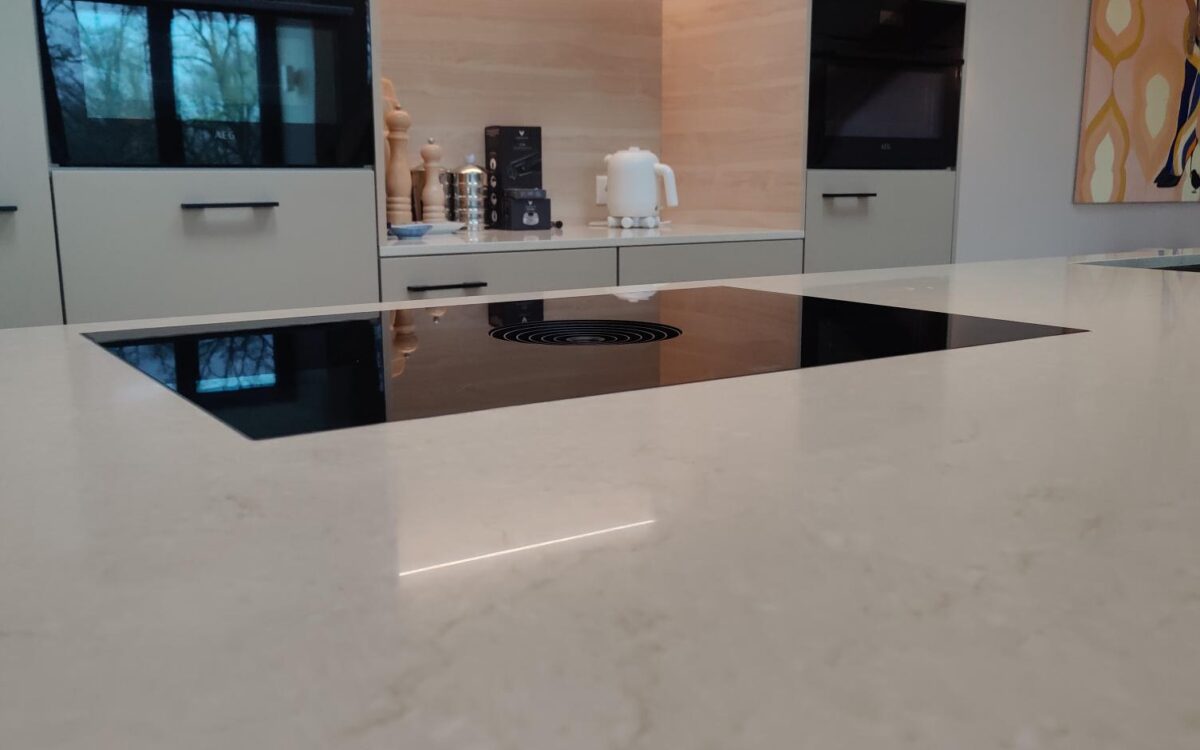 Het werkblad, gemaakt door Kemie, is een pronkstuk op zich. Het hoogwaardige materiaal is niet alleen visueel aantrekkelijk, maar ook zeer praktisch. Het blad is bestand tegen intensief gebruik waardoor het ideaal is voor een keuken die zowel design als functionaliteit combineert.Deze keuken is uitgerust met stijlvolle apparatuur van AEG.
