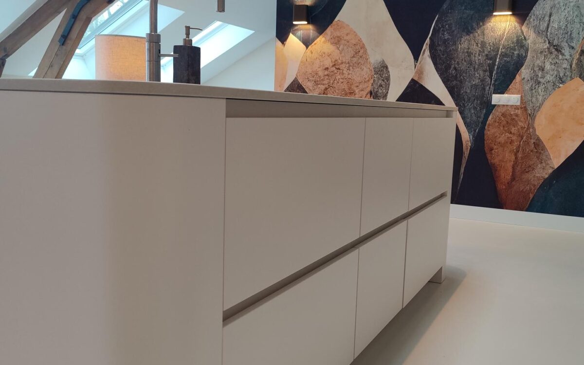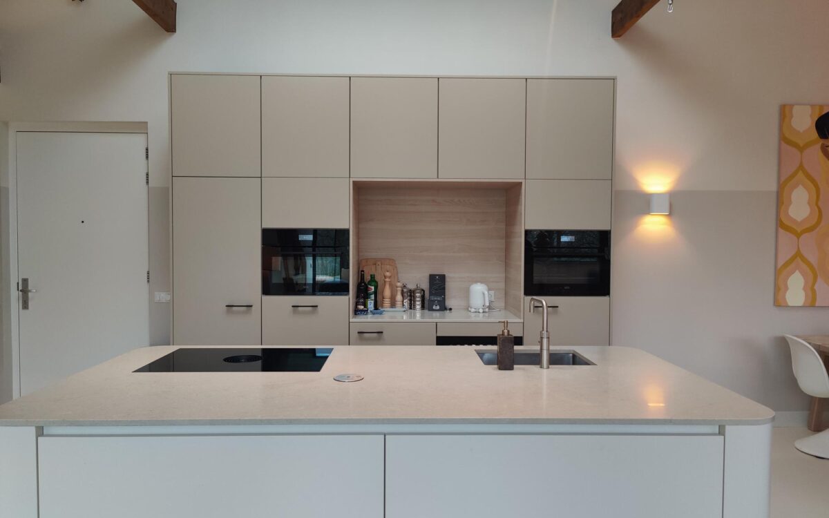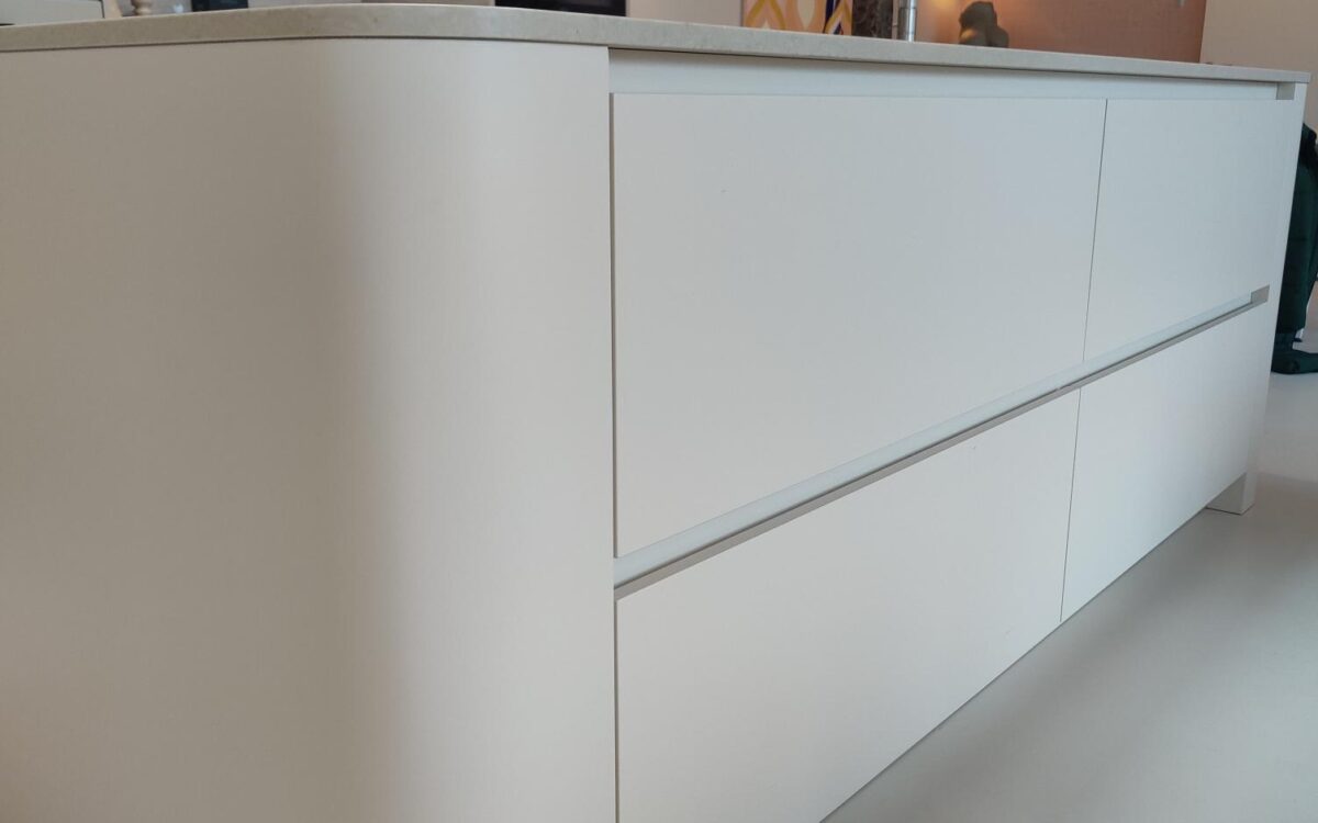 De fronten zijn strak en elegant afgewerkt met hoogwaardig spuitwerk van Siis. Deze afwerking biedt niet alleen een moderne uitstraling, maar is ook duurzaam en onderhoudsvriendelijk. Perfect voor een stijlvolle en praktische keuken.