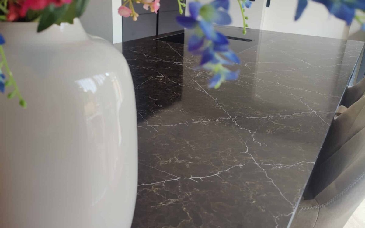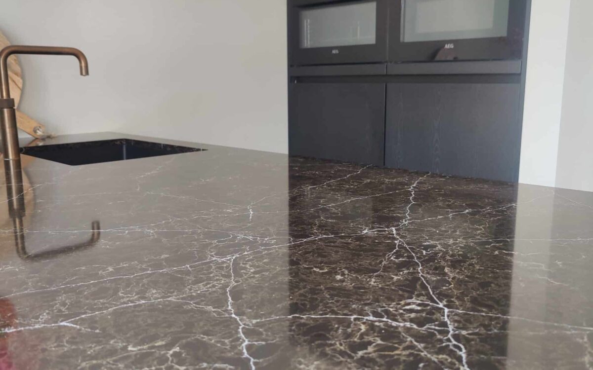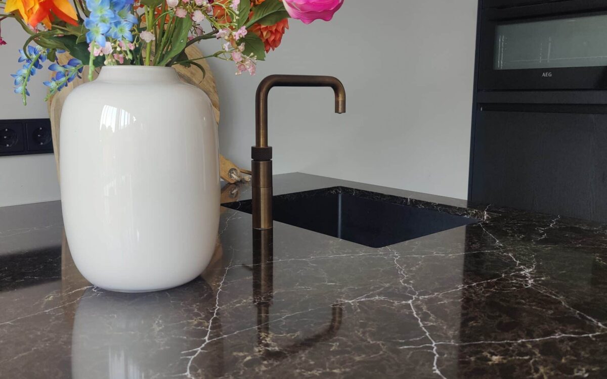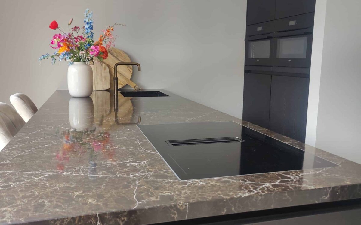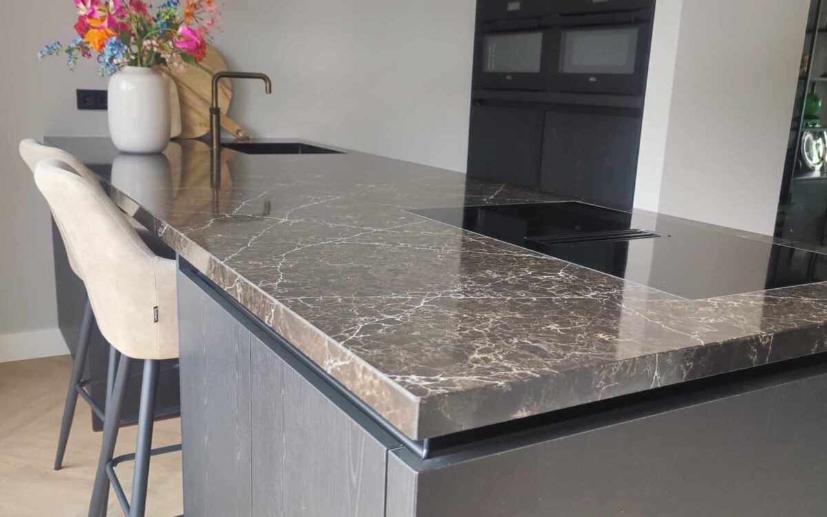 Het 4 cm dikke werkblad in glanzend Kemie Mars voegt diepte en een subtiel lichtspel toe. De natuurlijke adering zorgt voor een elegant contrast met de donkere kasten en versterkt de luxe uitstraling van de keuken. Dankzij de doordachte indeling en ruime opbergmogelijkheden blijft het werkblad altijd opgeruimd, zonder in te leveren op esthetiek.