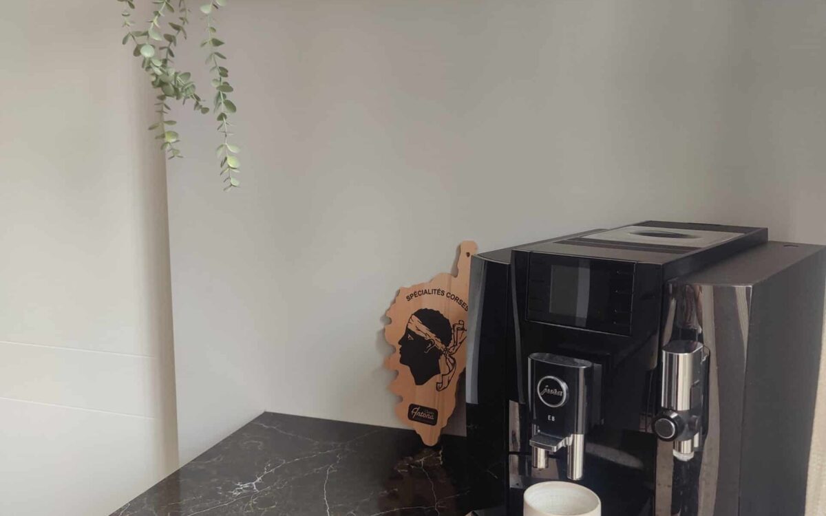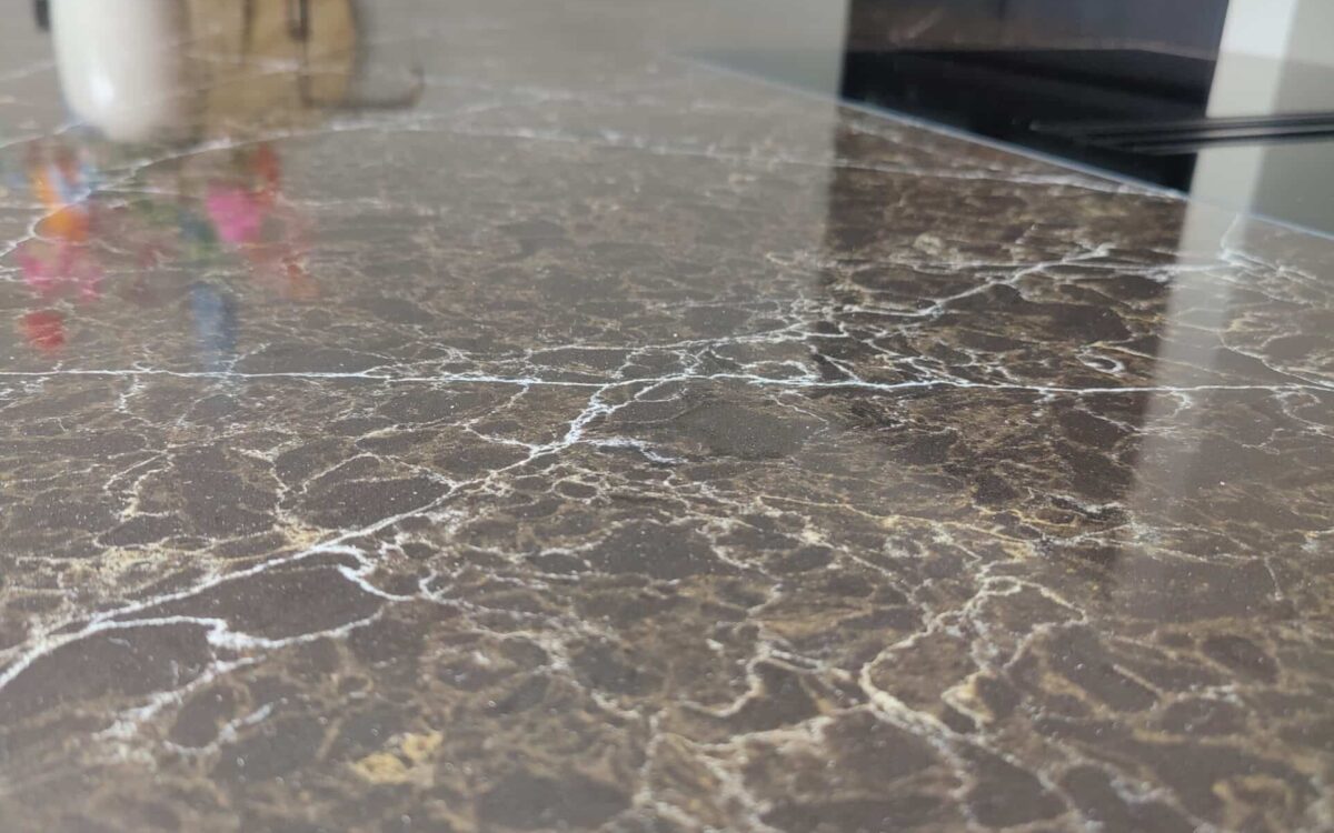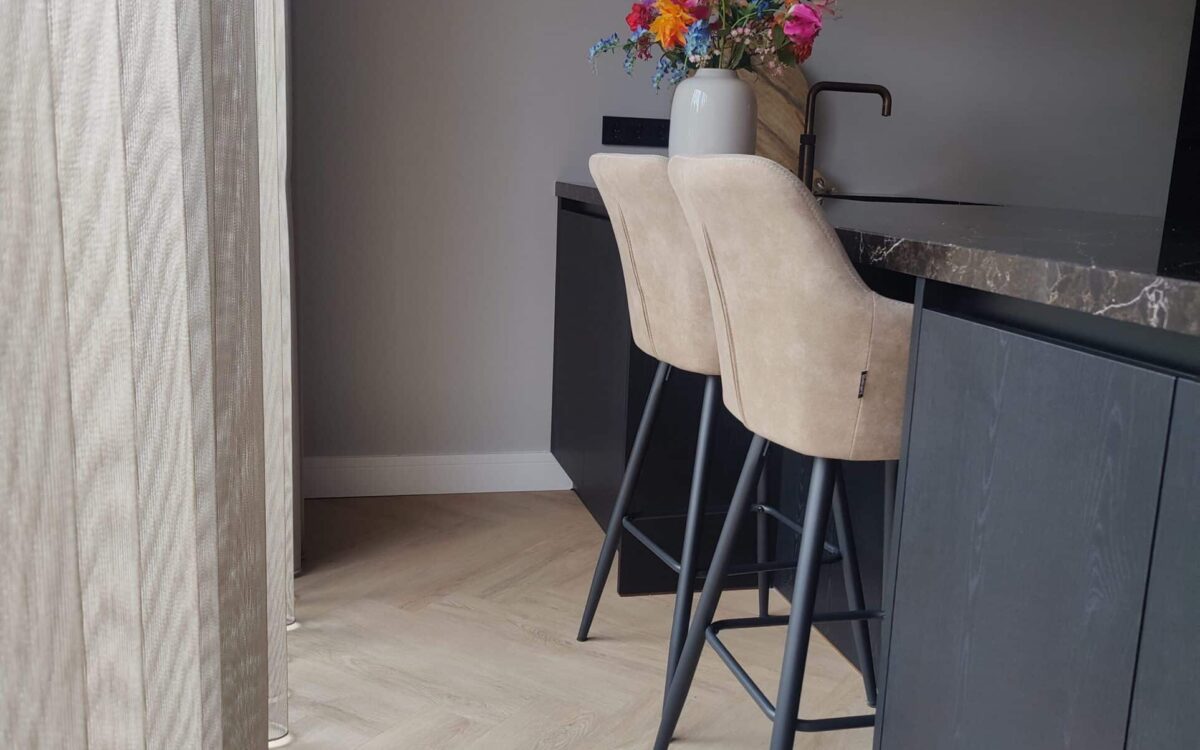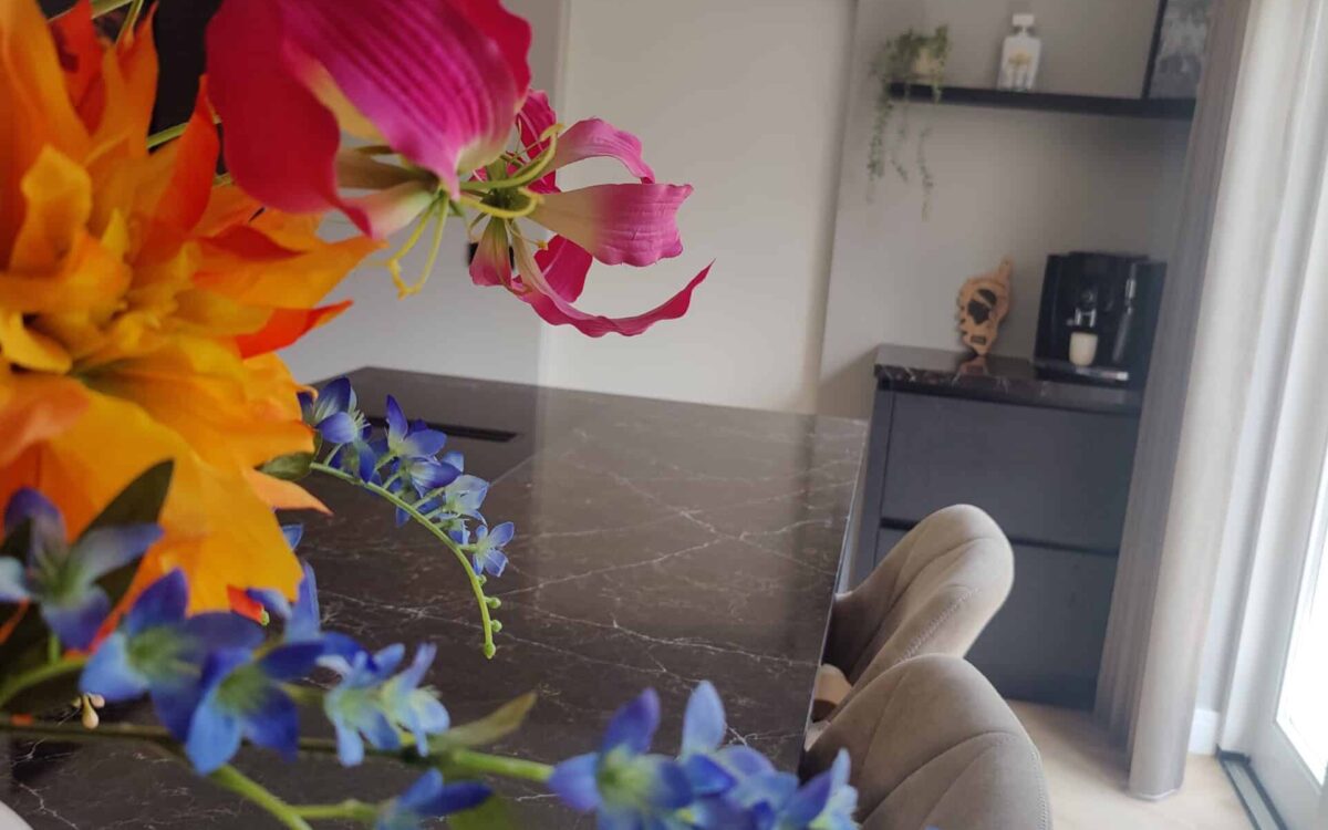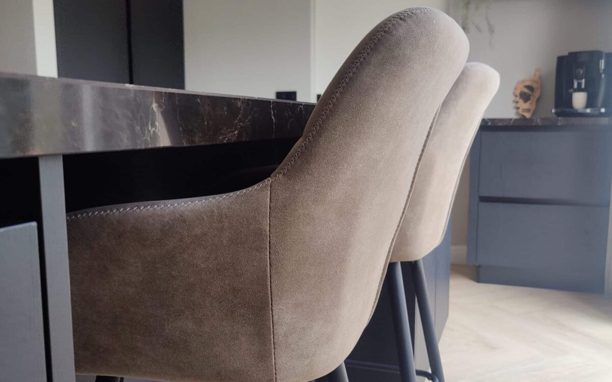 Het 4 cm dikke werkblad in glanzend Kemie Mars voegt diepte en een subtiel lichtspel toe. De natuurlijke adering zorgt voor een elegant contrast met de donkere kasten en versterkt de luxe uitstraling van de keuken. Dankzij de doordachte indeling en ruime opbergmogelijkheden blijft het werkblad altijd opgeruimd, zonder in te leveren op esthetiek.