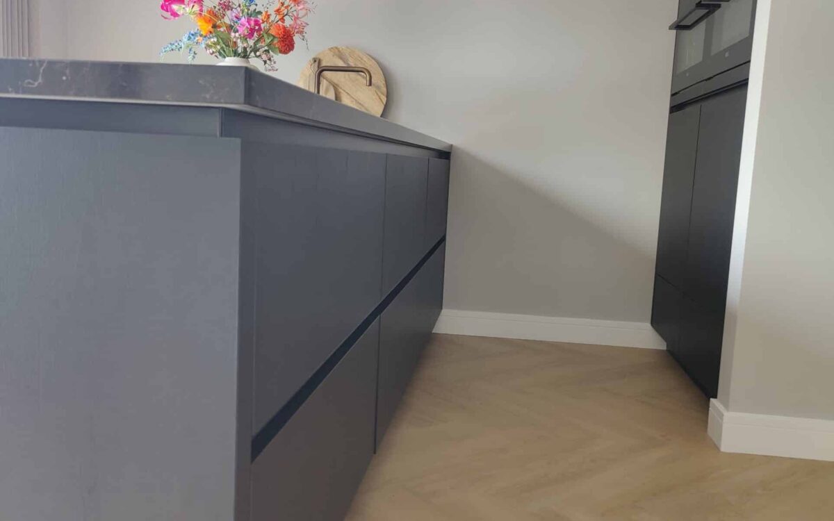 Deze stijlvolle keuken combineert functionaliteit met verfijnd design. De fronten in zwart hout met verticale nerf geven een elegante, tijdloze uitstraling. De zwarte greeplijsten zorgen voor een strak en minimalistisch geheel.