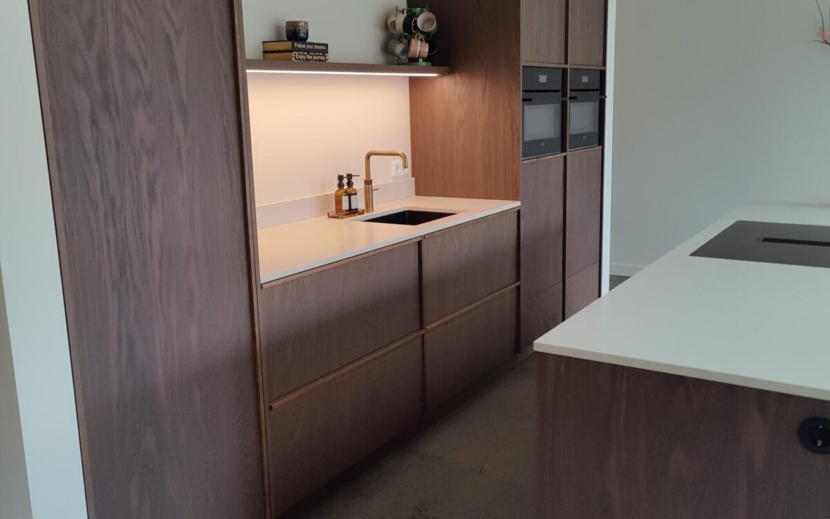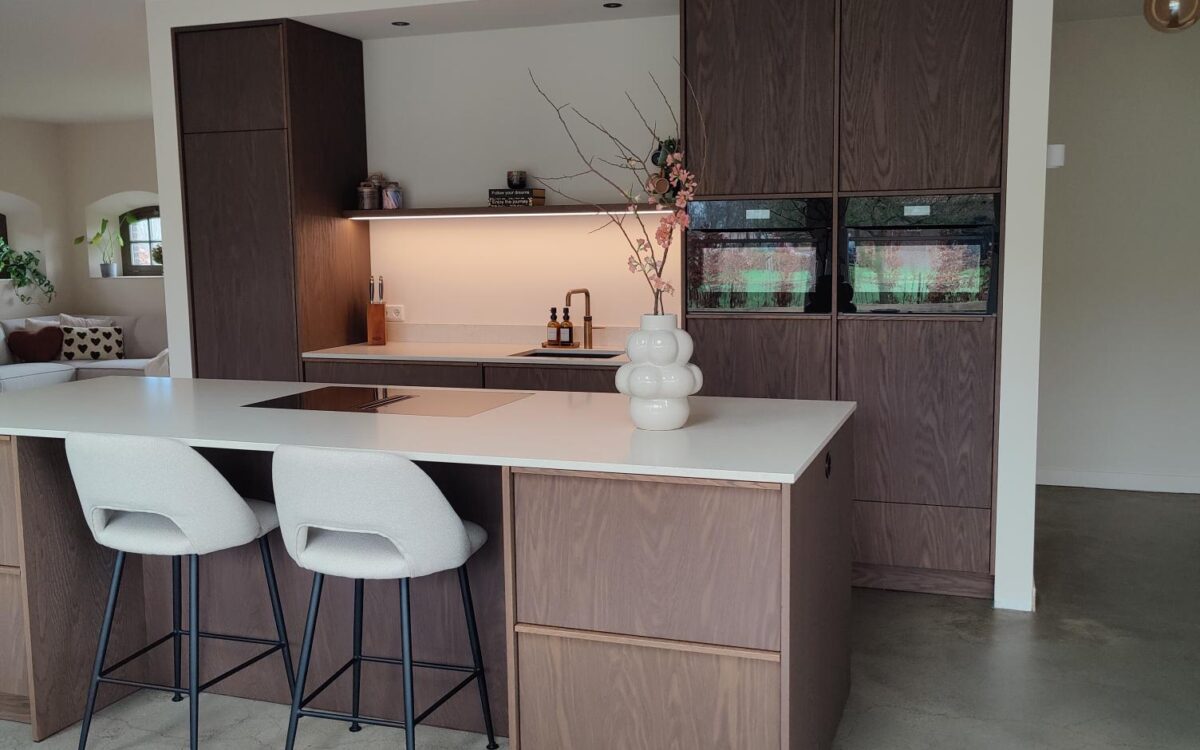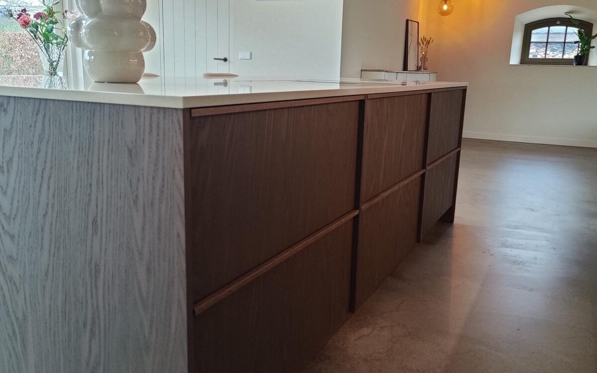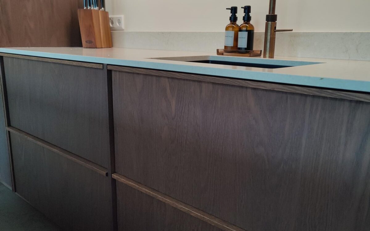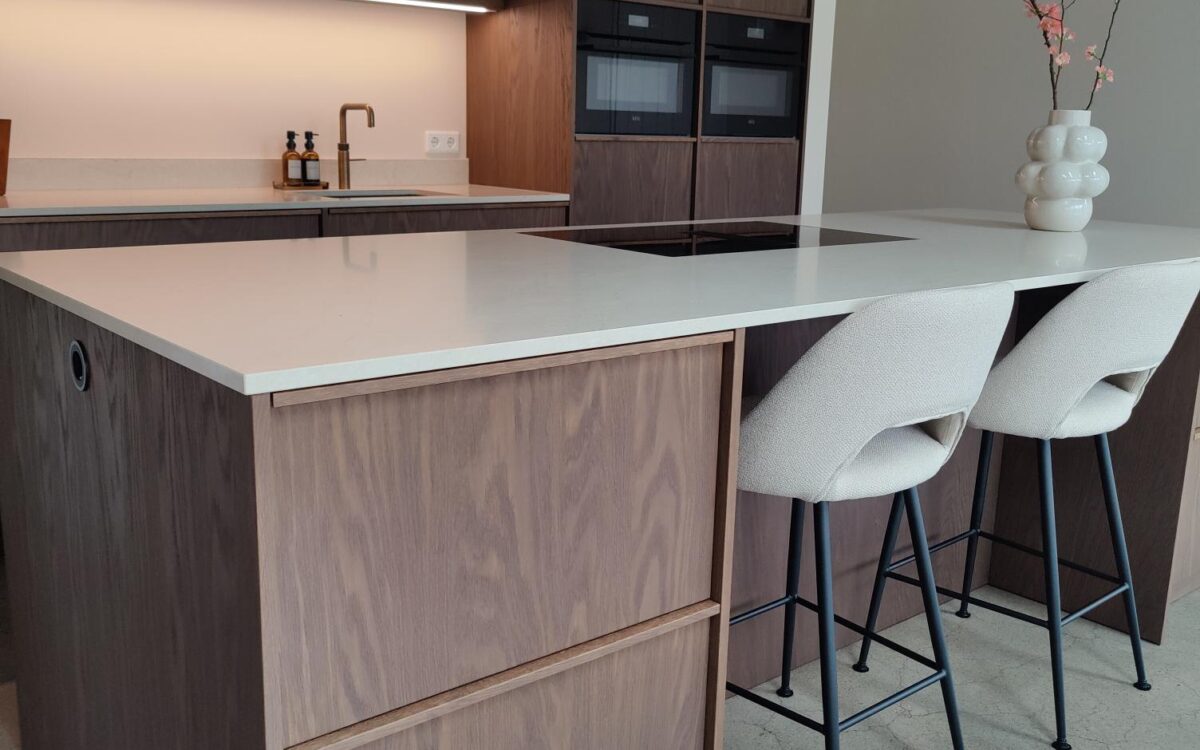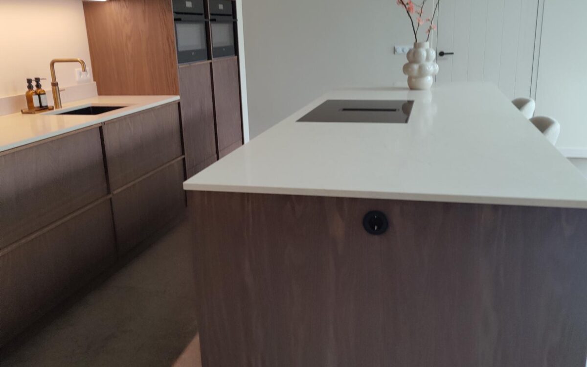 Fronten: eikenfineer met massieve eiken latjes er op verwerkt en gebeitst in kleur door spuiterij Siis – een strakke en duurzame afwerking die perfect past bij het moderne design. Blad: Werkblad van Kemie, bekend om zijn kwaliteit en tijdloze uitstraling, ideaal voor intensief gebruik. Apparatuur: Moderne en betrouwbare AEG-apparatuur, die functionaliteit en comfort combineert.