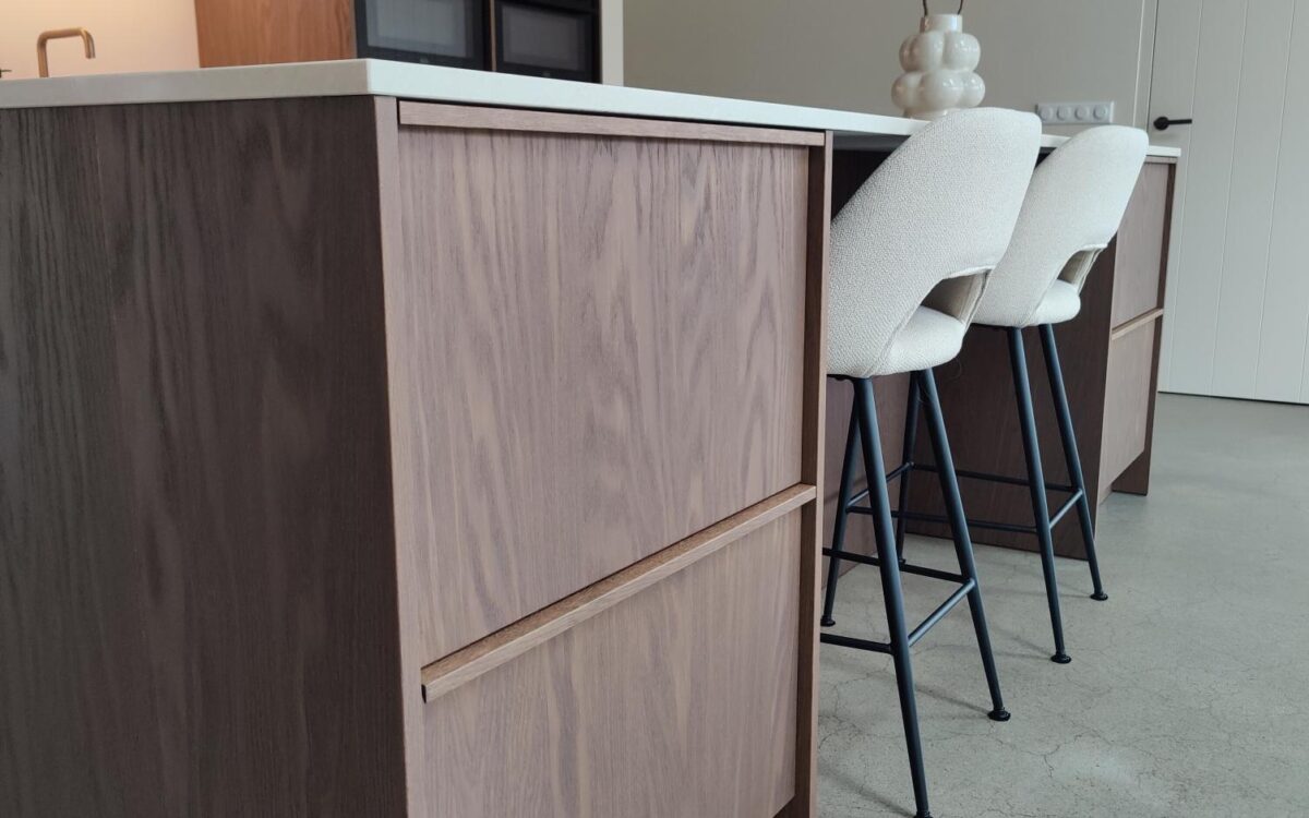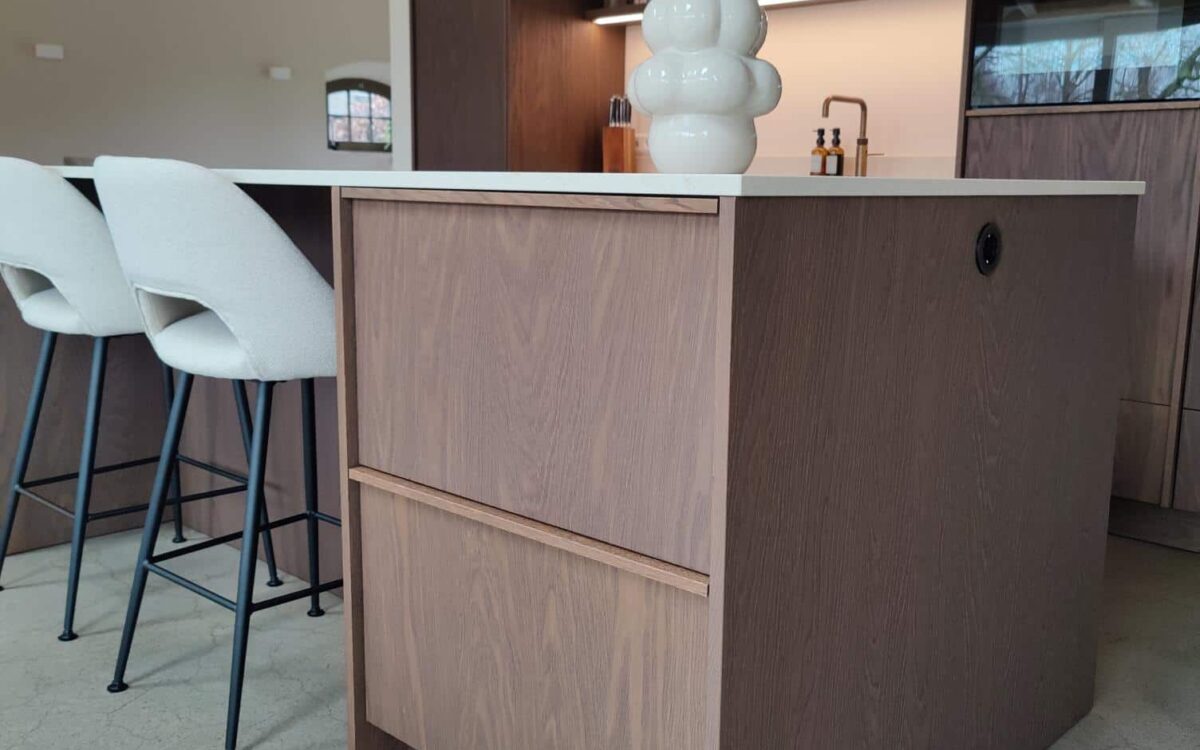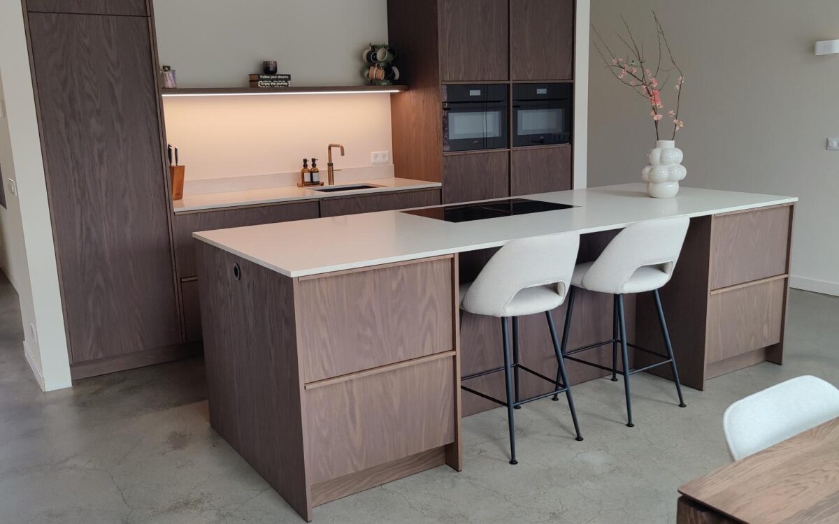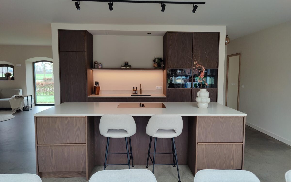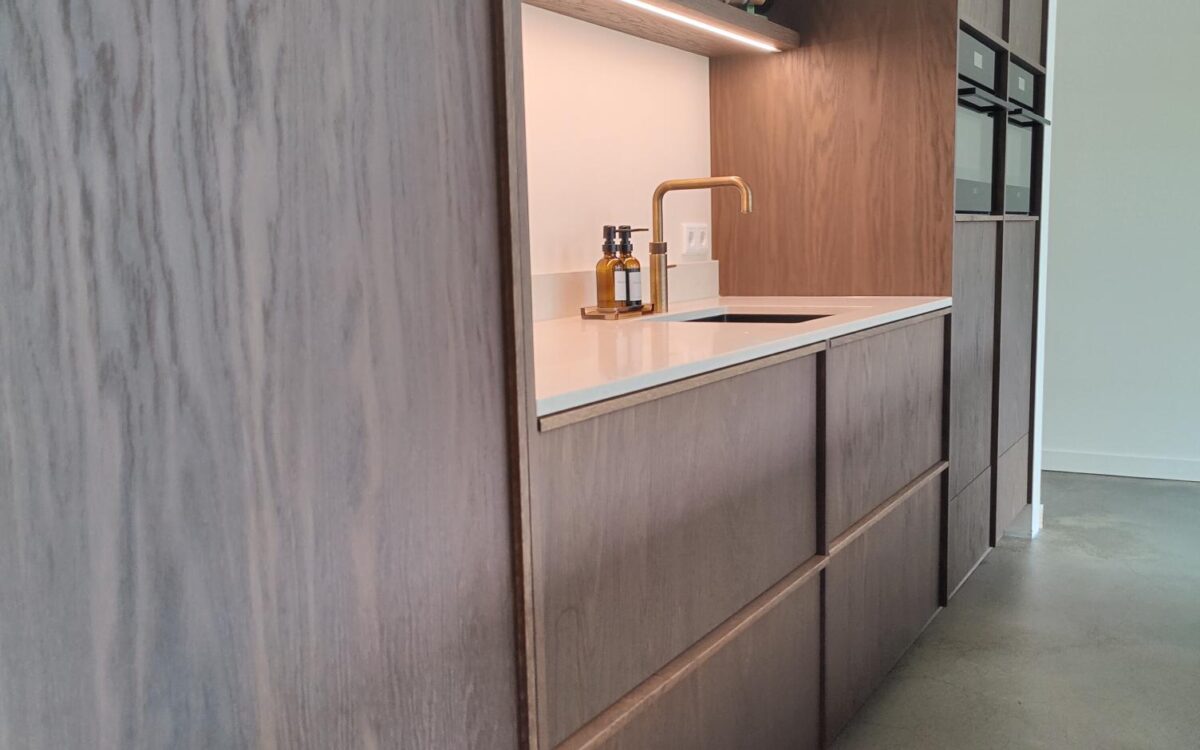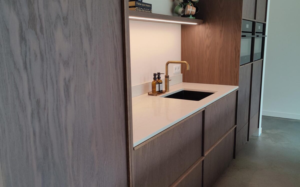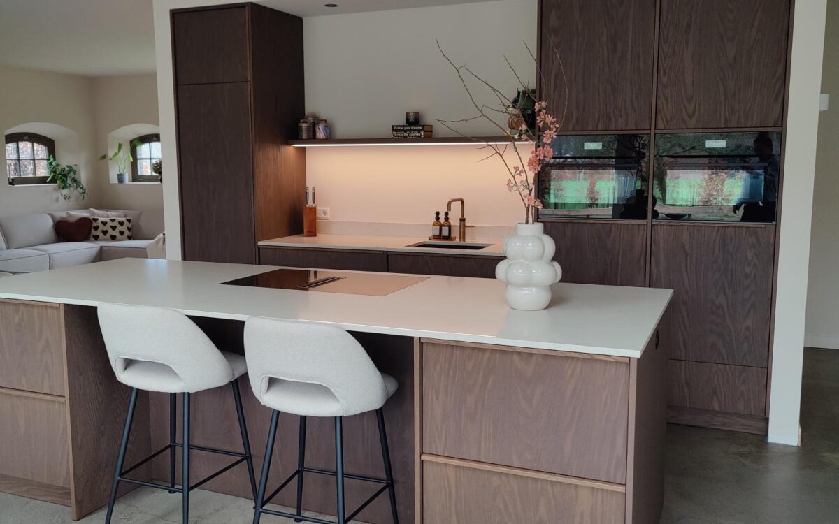 Fronten: eikenfineer met massieve eiken latjes er op verwerkt en gebeitst in kleur door spuiterij Siis – een strakke en duurzame afwerking die perfect past bij het moderne design. Blad: Werkblad van Kemie, bekend om zijn kwaliteit en tijdloze uitstraling, ideaal voor intensief gebruik. Apparatuur: Moderne en betrouwbare AEG-apparatuur, die functionaliteit en comfort combineert.