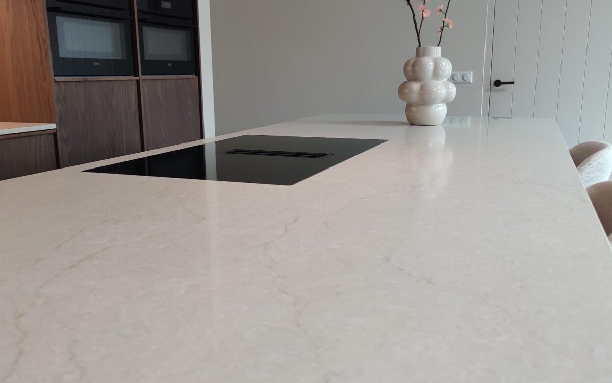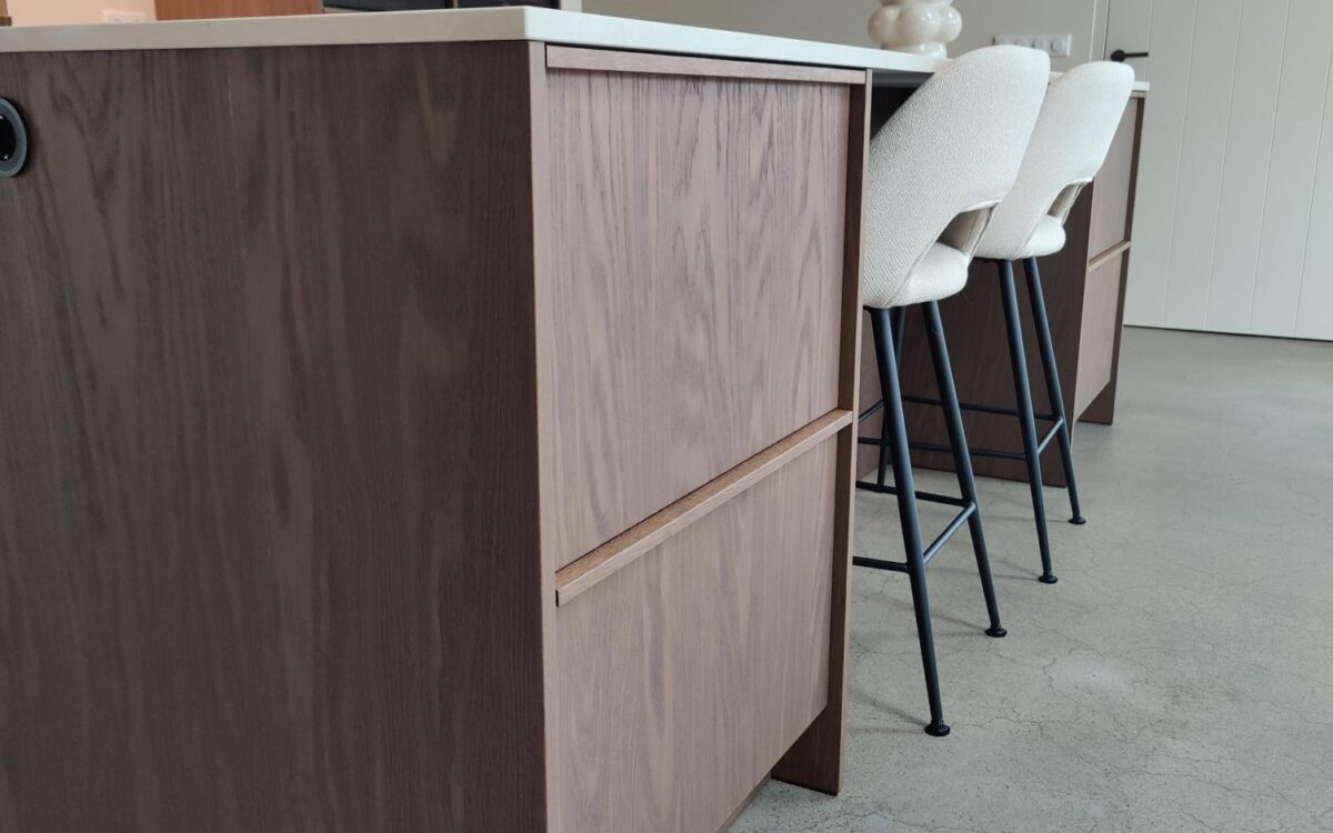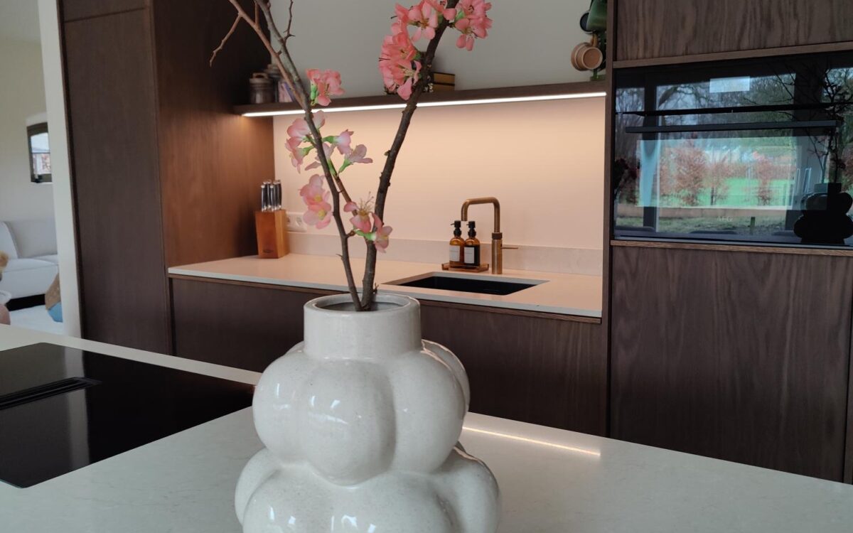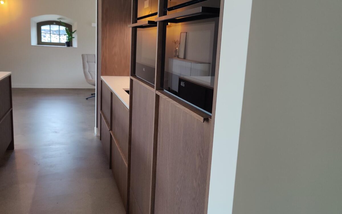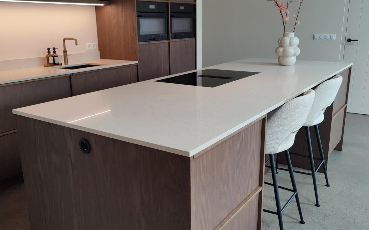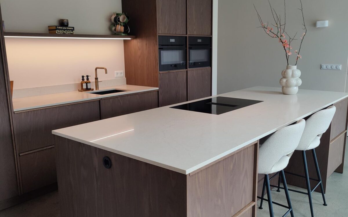 Fronten: eikenfineer met massieve eiken latjes er op verwerkt en gebeitst in kleur door spuiterij Siis – een strakke en duurzame afwerking die perfect past bij het moderne design. Blad: Werkblad van Kemie, bekend om zijn kwaliteit en tijdloze uitstraling, ideaal voor intensief gebruik. Apparatuur: Moderne en betrouwbare AEG-apparatuur, die functionaliteit en comfort combineert.